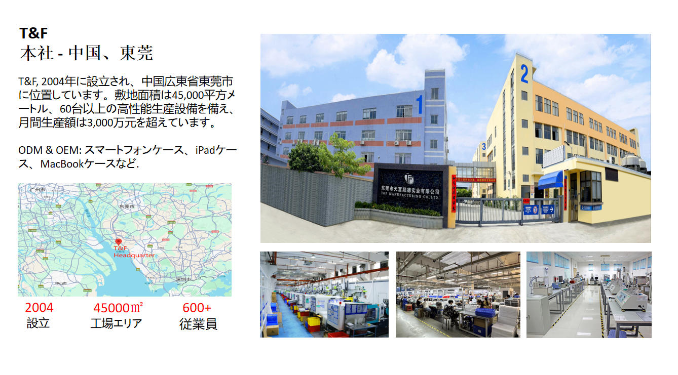 東関天フルイド工業株式会社(T&F)は2004年に設立されました。T&Fは、革新的なスマートハードウェアおよび携帯電話タブレットアクセサリ業界で世界をリードするハードウェアOEM / ODMメーカーに発展し、主にさまざまなスマートハードウェアの製造と運用を行っています。 、スマートウォッチ、ワイヤレス充電器、PD充電器、スマート電源、データケーブル、TPU保護スリーブ、PC保護スリーブ、2色シェル、レザーケース、強化ガラスフィルムなどの携帯電話タブレットアクセサリ。同社はISO9001-2008およびQC080000認証に合格しています。工業団地は中国の東関にあり、面積は約45,000平方メートルです。 1,000人以上の従業員。