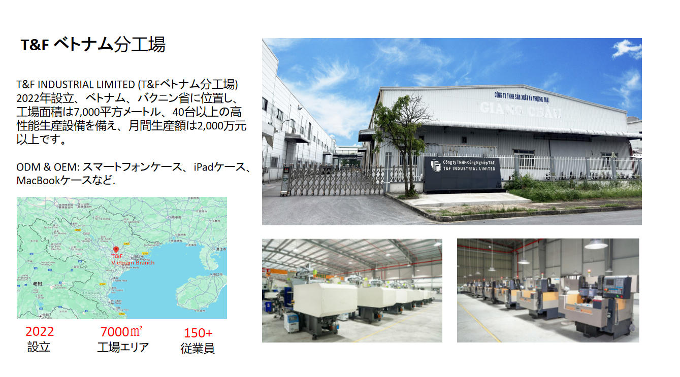 2022年ベトナム、バクニン省に分工場を設立し、敷地面積7000平方メートル、工場面積5200平方メートル、先進的な精密射出成形機40台と押出成形機を保有しています。